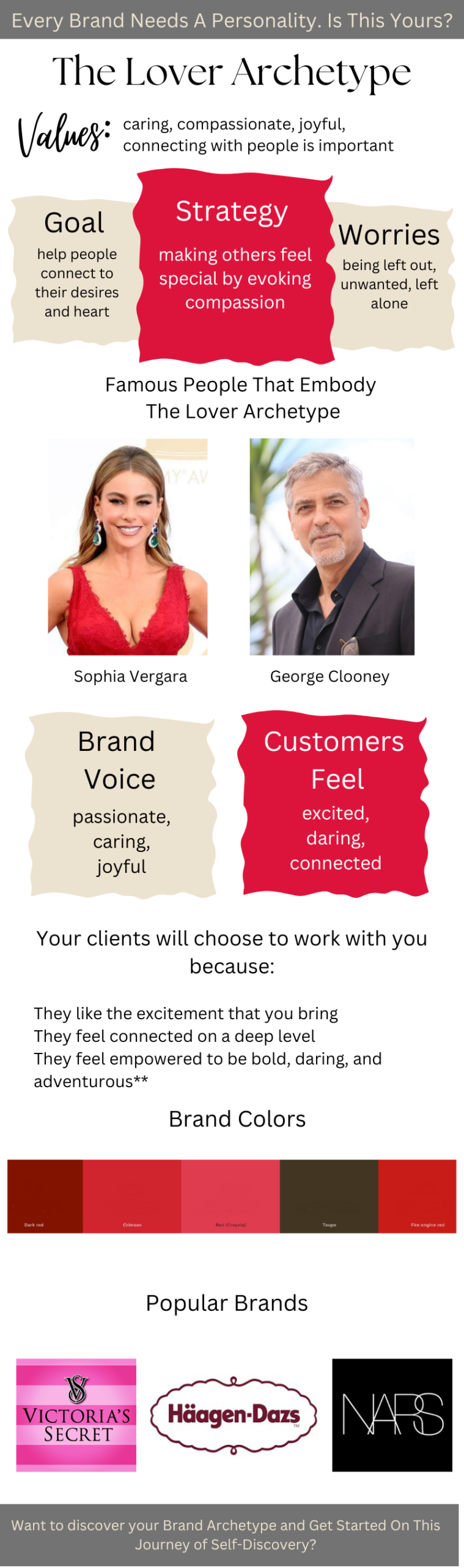 This is just a suggested color scheme for the Lover archetype. Your brand colors should be developed based on an in-depth brand strategy and brand identity.